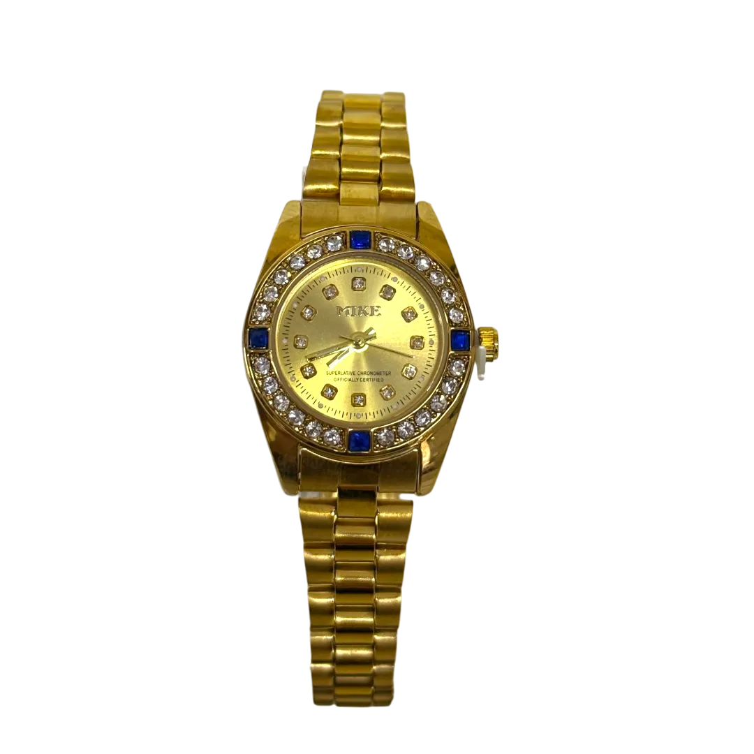 Mike Classy Watch For Women - Gold With Blue Rhinestones